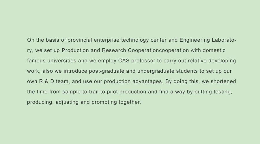 On the basis of provincial enterprise technology center and Engineering Laboratory, we set up Production and Research Cooperation  cooperation with domestic famous universities and we employ CAS professor to carry out relative developing work, also we introduce post-graduate and undergraduate students to set up our own R & D team, and use our production advantages. By doing this, we shortened the time from sample to trail to pilot production and find a way by putting testing, producing, adjusting and promoting together.